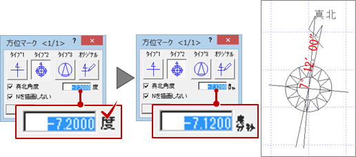 Q:方位マークの真北角度を「度分秒」で入力する方法を教えてください。