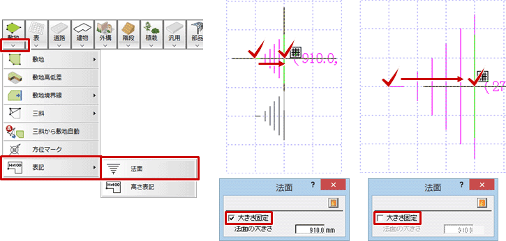 A:「敷地」メニューの「表記」の「法面」を使用して、法面を入力します。