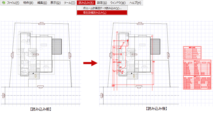 A:「読み込み」メニューの「衛生設備読み込み」で、衛生設備平面図1階から設備のシンボルを読み込みます。