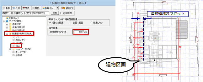 読み込む場合に、「配置図 専用初期設定-読込」の「衛生設備」にある「建物領域オフセット」が影響します。建物区画から内側に、オフセット値までの範囲を読み込んで描画します。