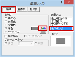 - 「塗潰し入力」ダイアログの「領域」がONになっていることを確認して、「表示レベル」を「最下(敷地)」に変更します。
