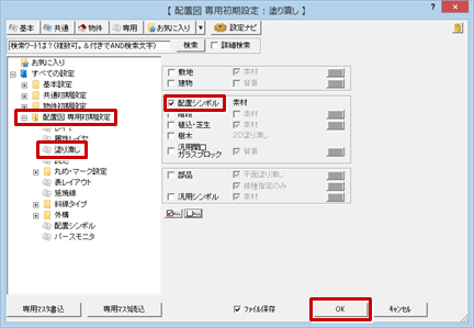 - 「専用初期設定:塗り潰し」の「配置シンボル」をONにして、「OK」をクリックします。