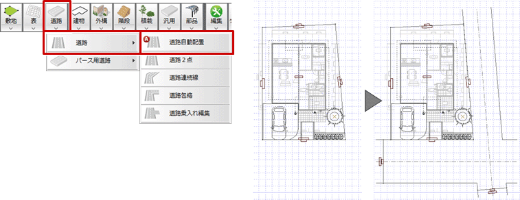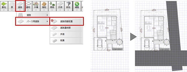 - 「道路」メニューから「パース用道路」の「道路自動配置」を選びます。