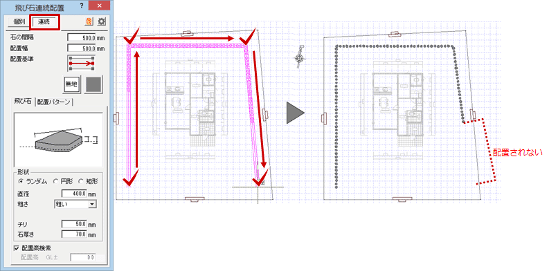 Q:飛び石を連続配置するときに、指定した範囲すべてに配置されないときの理由について教えてください。