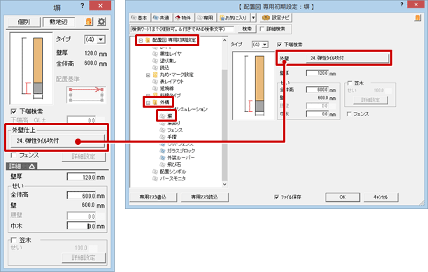 A:配置図の「専用初期設定:外構-塀」の「外壁」で仕上の初期値を設定します。