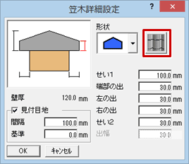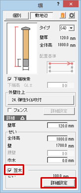「塀」ダイアログの「笠木」をONにして、「詳細設定」をクリックします。