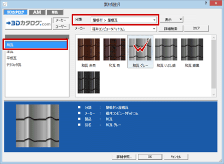 「素材選択」ダイアログの「分類」を「屋根材>屋根瓦」にして、「和瓦」から「和瓦 グレー」を選択します。