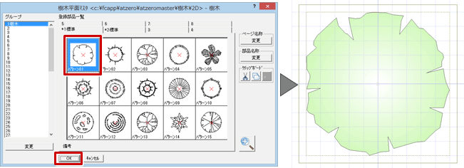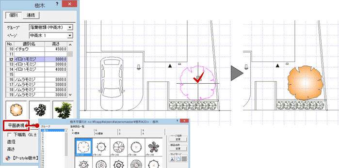 - 「樹木」ダイアログの「平面表現」で塗り潰し色が変更した色になっていることを確認して、配置位置をクリックします。