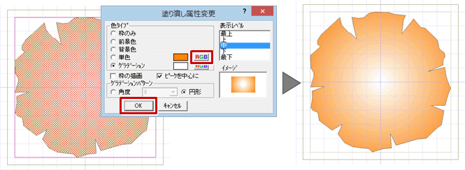 - 「塗り潰し属性変更」ダイアログの「RGB」で色を設定して、「OK」をクリックします。