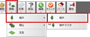 - 配置図を開き、「植栽」メニューから「樹木」の「樹木」を選びます。