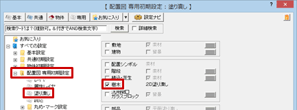 - 樹木を配置したときに塗り潰しを表示するには、「専用初期設定:塗り潰し」の「樹木」をONにします。