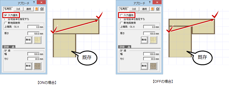 入力ダイアログの「入力優先」がOFFの場合は既存のアプローチの領域が優先され、ONの場合は後に入力するアプローチの入力範囲が優先されます。