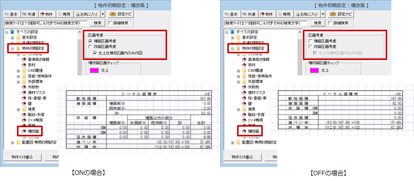 A:「物件初期設定:増改築」の「増築区画考慮」や「改築区画考慮」がONの場合は、トータル面積表に増改築面積欄が表示されます。必要のない場合はOFFにしてからトータル面積表を再作成してください。