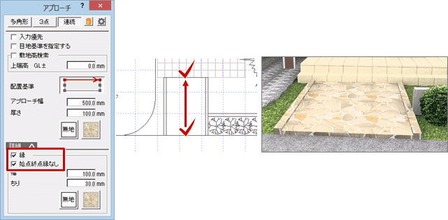入力済みのアプローチの縁は、「外構」メニューの「アプローチ」の「アプローチ縁指定」コマンドで削除、追加が可能です。