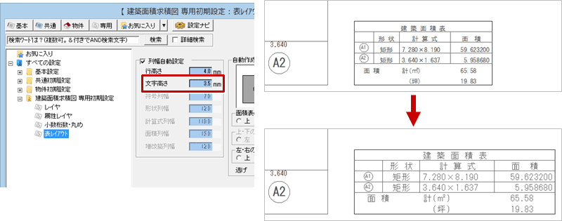A:建築面積求積図の「専用初期設定:表レイアウト」の「文字高さ」で文字サイズを設定します。文字サイズに連動するように、表のサイズも変わります。