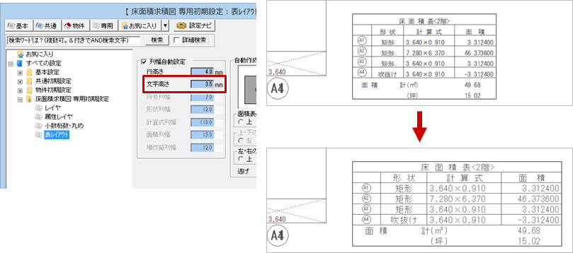 A:床面積求積図の「専用初期設定:表レイアウト」の「文字高さ」で文字サイズを設定します。文字サイズに連動するように、表のサイズも変わります。
