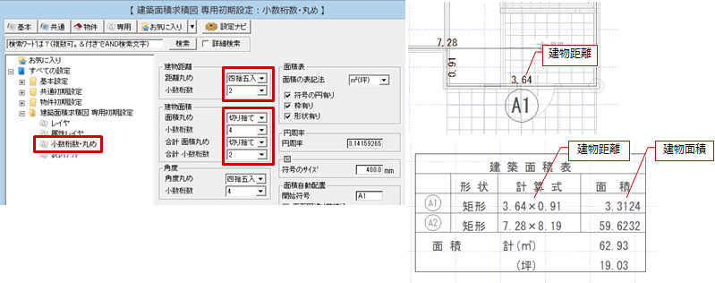 A:建築面積求積図の「専用初期設定:小数桁数・丸め」の「建物距離」と「建物面積」で設定します。