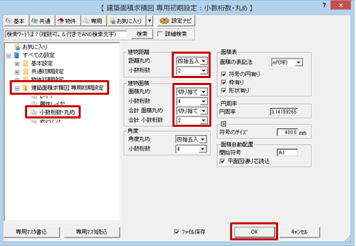 - 「専用初期設定:小数桁数・丸め」の「建物距離」と「建物面積」を設定して、「OK」をクリックします。