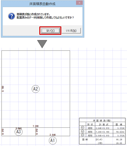A:「床面積(矩形)」を使用して床面積を追加し、床面積表を再作成します。