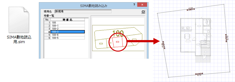 A:「敷地」メニューの「敷地」の「SIMA敷地読み込み」から、SIMAファイル(*.sim)を読み込みます。