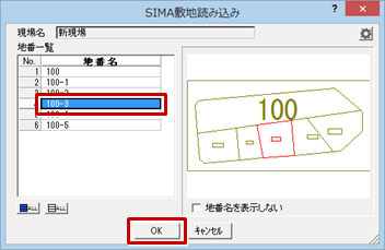 - ダイアログの「地番一覧」で配置する敷地の地番名を選択します。