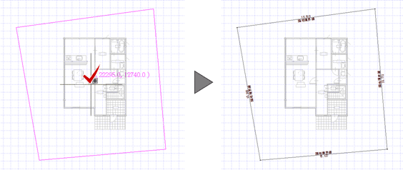 ただし、汎用コマンドの「複写」(回転複写、鏡像複写なども含む)、「反転」(平行反転も含む)などで編集された敷地に対しては作成できません。