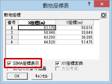 - 上記手順で配置された敷地は、「表」メニューの「敷地座標表」にて「SIMA座標表示」をONにすることで、SIMA座標系の敷地座標表を作成できます。