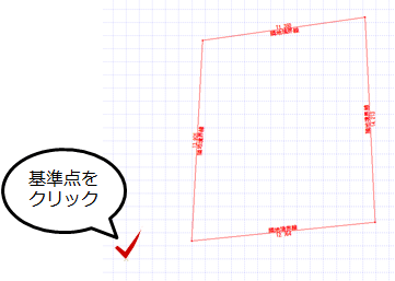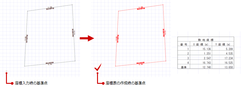 なお、敷地の座標入力は基準点からの相対座標値であるため、座標表を作成するときも、その敷地入力時と同じ基準点を指定する必要があります。
