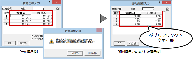 - 敷地の座標入力時、座標値が入力範囲を超えていると相対座標に置き換えられます。その場合、お手元の敷地測量図の座標値とは異なるものになるため、表の座標値は手入力する必要があります。