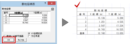 - 「敷地座標表」ダイアログで座標値を確認して、「OK」をクリックします。
