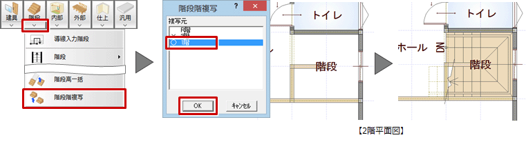 ※ 1階平面図に階段が入力されていない場合は階段を入力後、2階平面図に階段を複写してください。