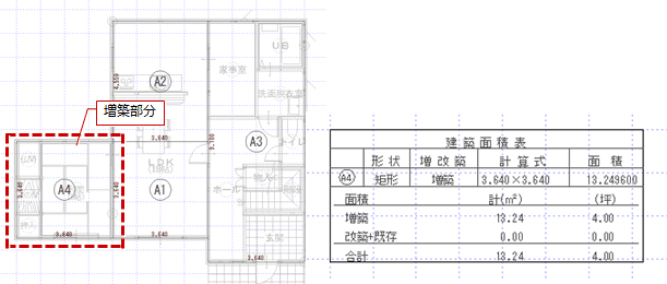 A:区画を既存部分と増築部分に分割し、「表」メニューの「建築面積表個別作成」を使用して、増築部分だけの建築面積表を作成します。