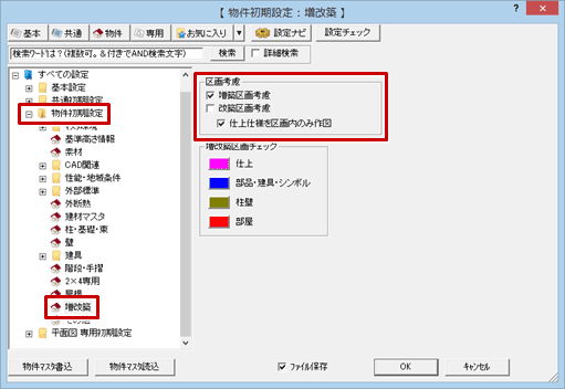 「物件初期設定:増改築」の「増築区画考慮」や「築区画考慮」がONになっていることを確認します。