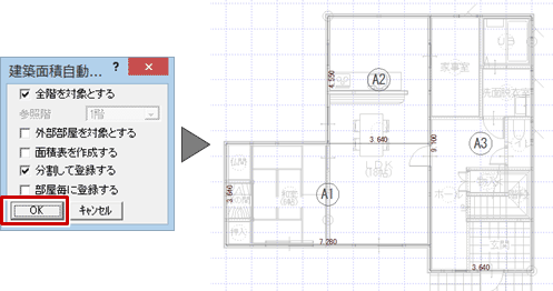 - 「建築面積自動」ダイアログの「OK」をクリックします。