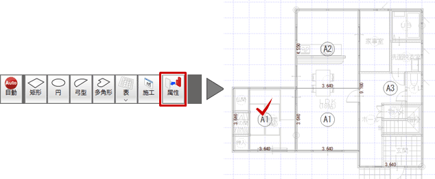 - 「属性変更」をクリックして、増築部分の建物区画を選択します。
