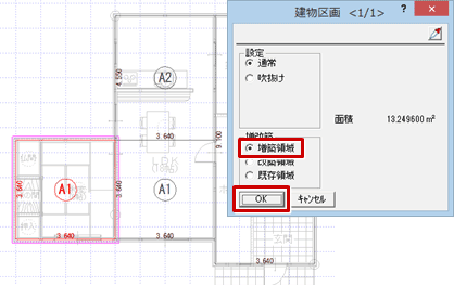 - 「建物区画」ダイアログの「増築領域」をONにして、「OK」をクリックします。