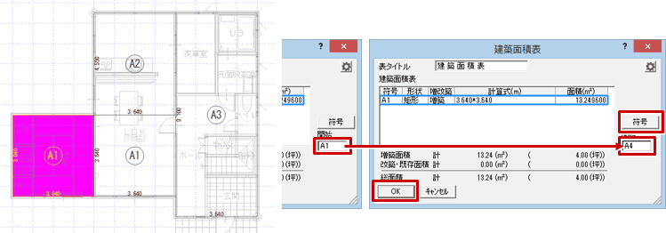 - 符号名を変更する場合は、「建築面積表」ダイアログの「開始」欄に符号の開始名を設定して、「符号」クリックします。