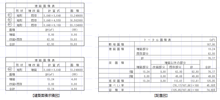 - 建築面積求積図で増築部分と既存部分の面積表を作成しても、配置図のトータル面積表ではまとめられて1つの表で作成されます。
