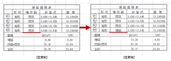 Q:建築面積表を作成したときに「増改築」欄の「既存」を「増築」に変更する方法を教えてください。