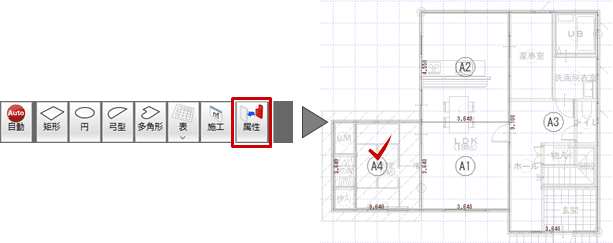 - 「属性変更」をクリックして、増築部分の建物区画を選択します。