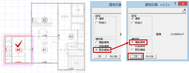 - 「建物区画」ダイアログの「増築領域」をONにして、「OK」をクリックします。