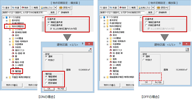 - 「建物区画」ダイアログの「増築領域」、「改築領域」を設定するには「物件初期設定:増改築」の「増築区画考慮」、「改築区画考慮」がONになっている必要があります。