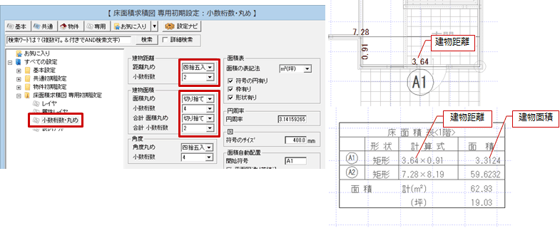 A:床面積求積図の「専用初期設定:小数桁数・丸め」で変更します。