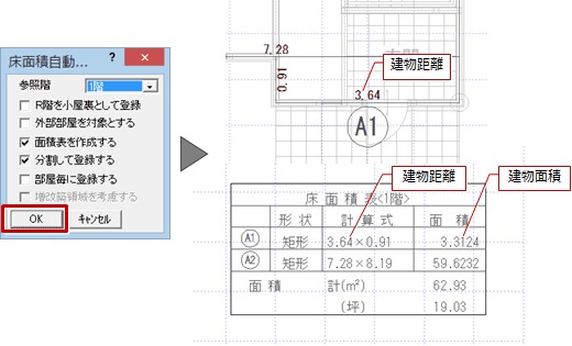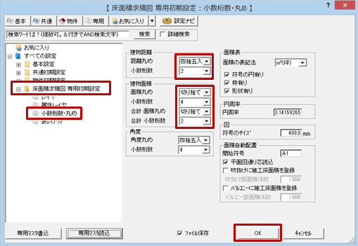 「専用初期設定:小数桁数・丸め」の「建物距離」と「建物面積」を設定して、「OK」をクリックします。