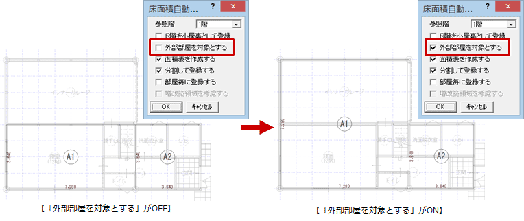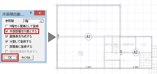 「床面積自動配置」ダイアログの「外部部屋を対象とする」をONにして、「OK」をクリックします。