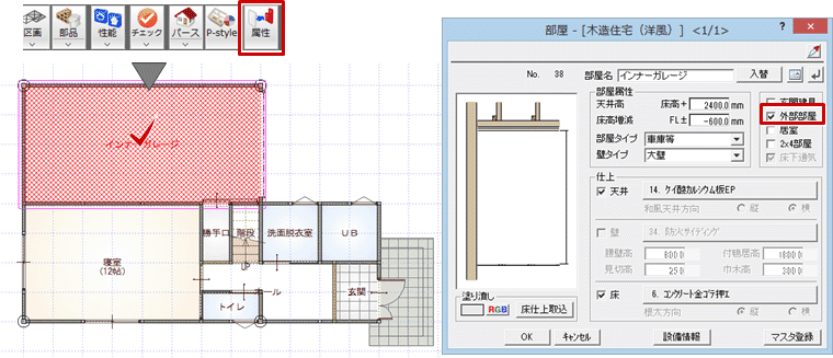 平面図を開き、インナーガレージの属性変更ダイアログの「外部部屋」がONになっていることを確認します。
