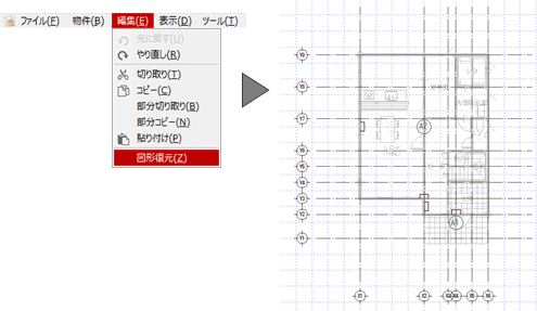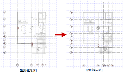 A:「床面積自動配置」では通り芯の線分は読み込まない仕様になっています。「編集」メニューの「図形復元」で通り芯の線分を表示してください。