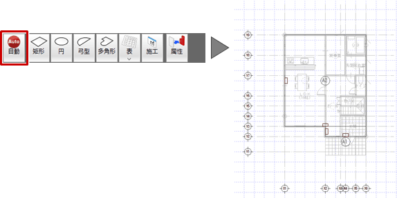 「床面積自動配置」をクリックして、区画と通り芯を配置します。