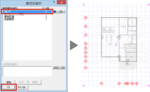 「属性別選択」ダイアログの「通り芯」を選択して、「OK」をクリックします。