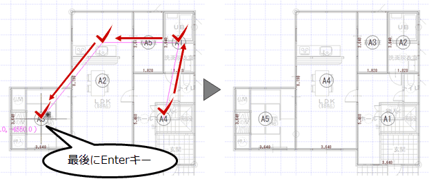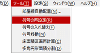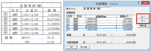 配置済みの面積表の符号も再設定されますが、その並び順は自動設定されません。面積表の属性変更ダイアログの「上へ」、「下へ」で移動してください。